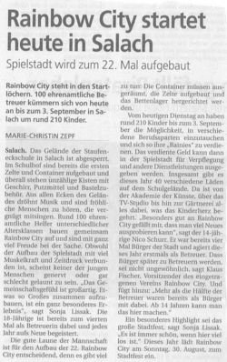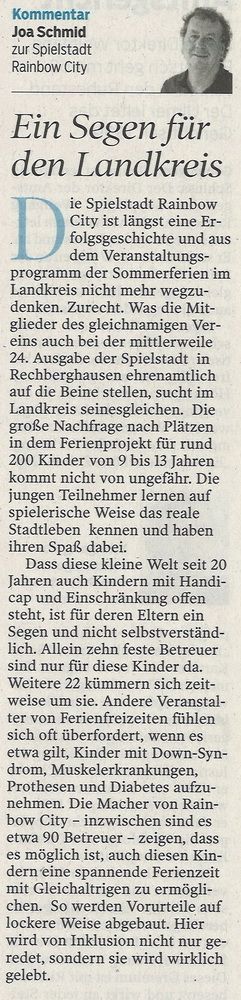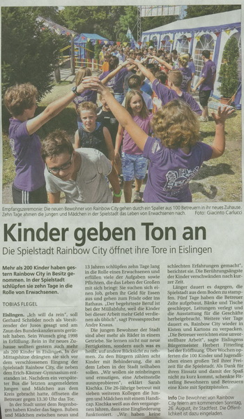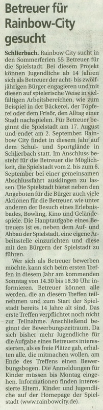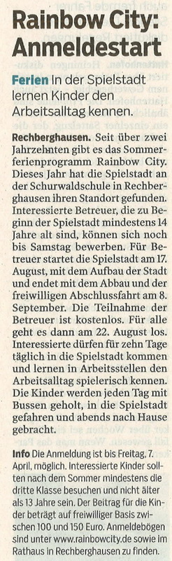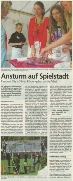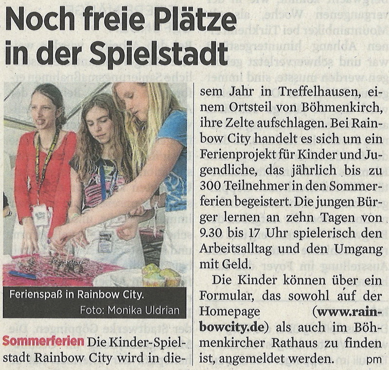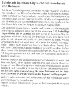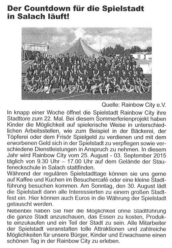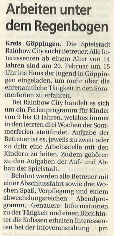 Rainbow City ist ein integratives Ferienprogramm im Landkreis Göppingen, das schon Der Göppinger Hohenstaufen-Loge gefällt an Rainbow City besonders, dass die Die Spielstatdt öffnet jedes Jahr in den Sommerferien ihre Tore. Teilnehmen dürfen Auch Jugendliche ab 14 Jahren können bei der Spielstadt mitwirken. Sie werden als Diese Jahr findet die Spielstadt auf dem Gelände der Schurwaldschule in Wer Interesse hat, kann sich noch bis zum 15. April 2017 bewerben. Die Bewerbungs- Für die Bürger beginnt die Spielstadt am 22. August und endet am 31. August 2017. |